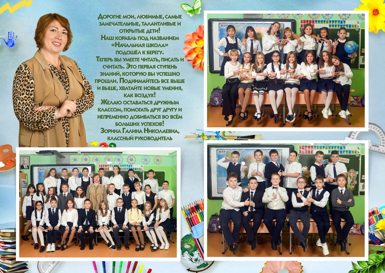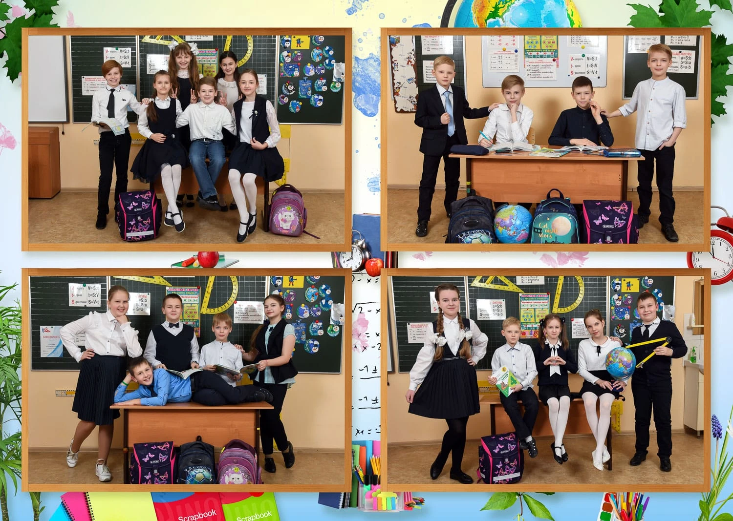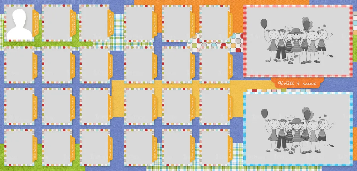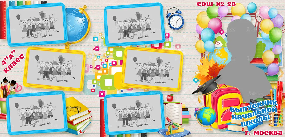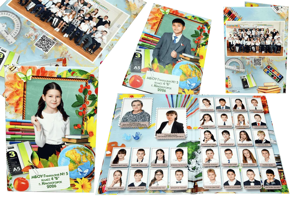 Я создаю папки для 1-4 классов с живыми фотографиями начальной школы, групповыми фото и портретами учеников — теплые школьные воспоминания для родителей и классного руководителя.