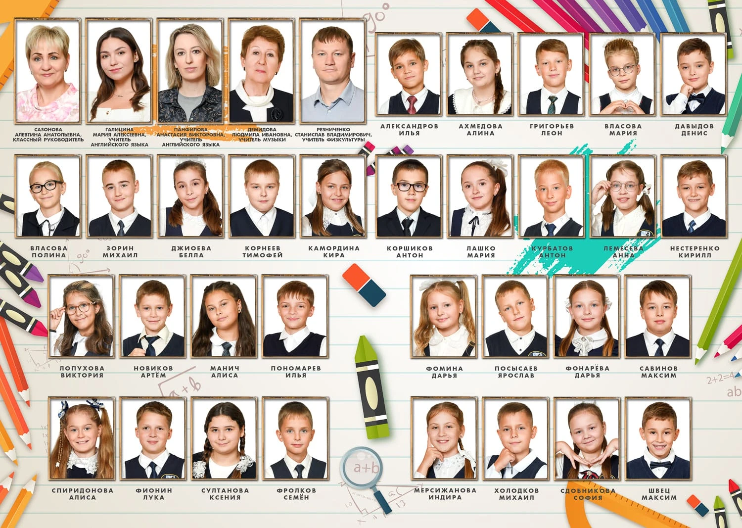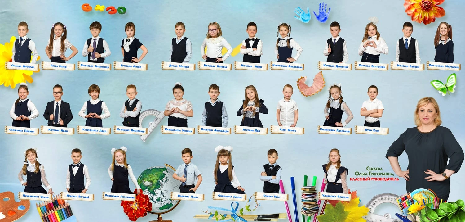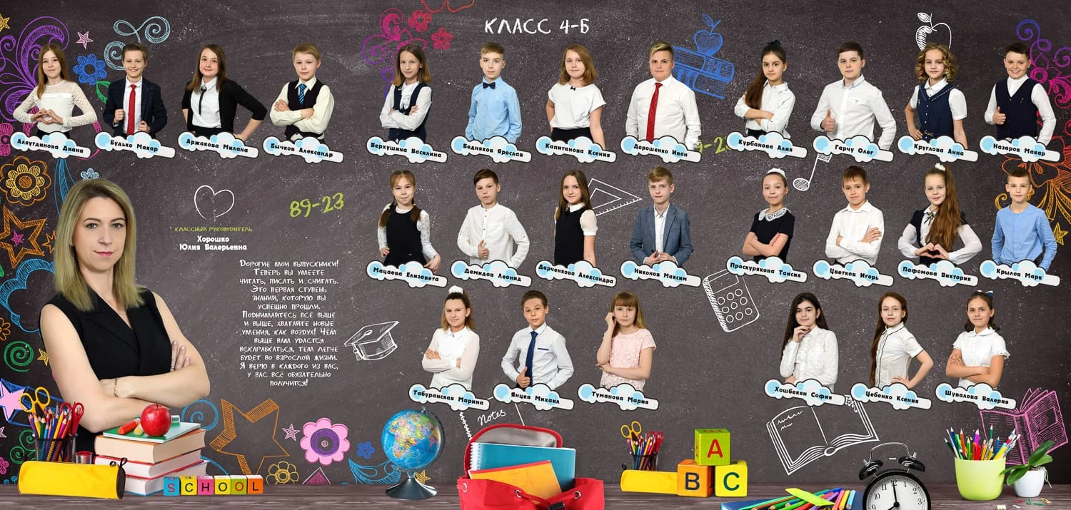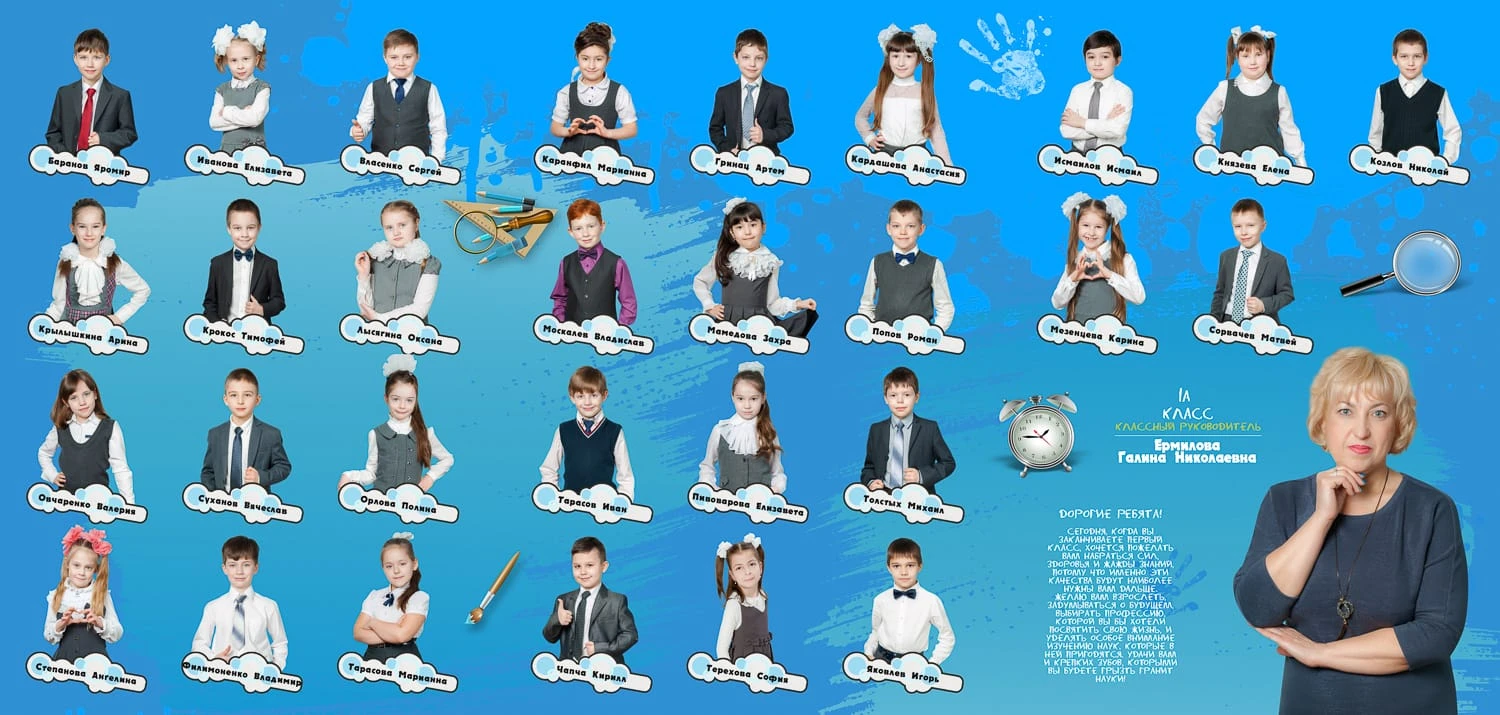 Портрет ребенка слева, справа все дети и учителя.