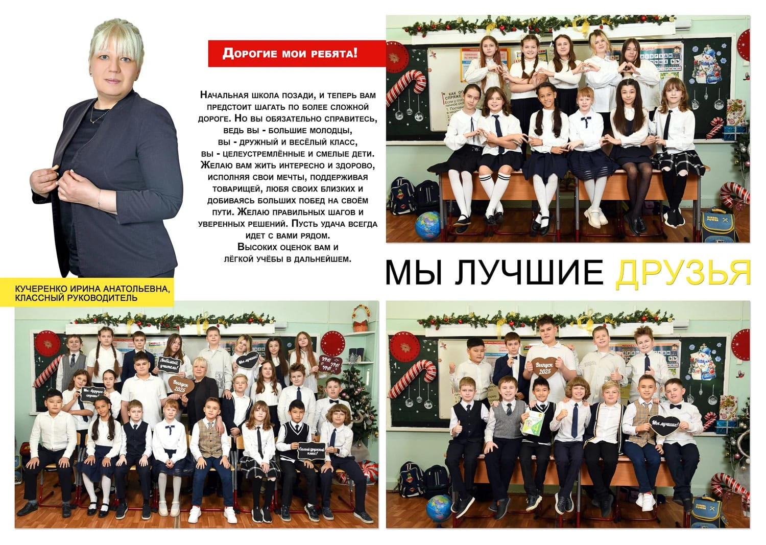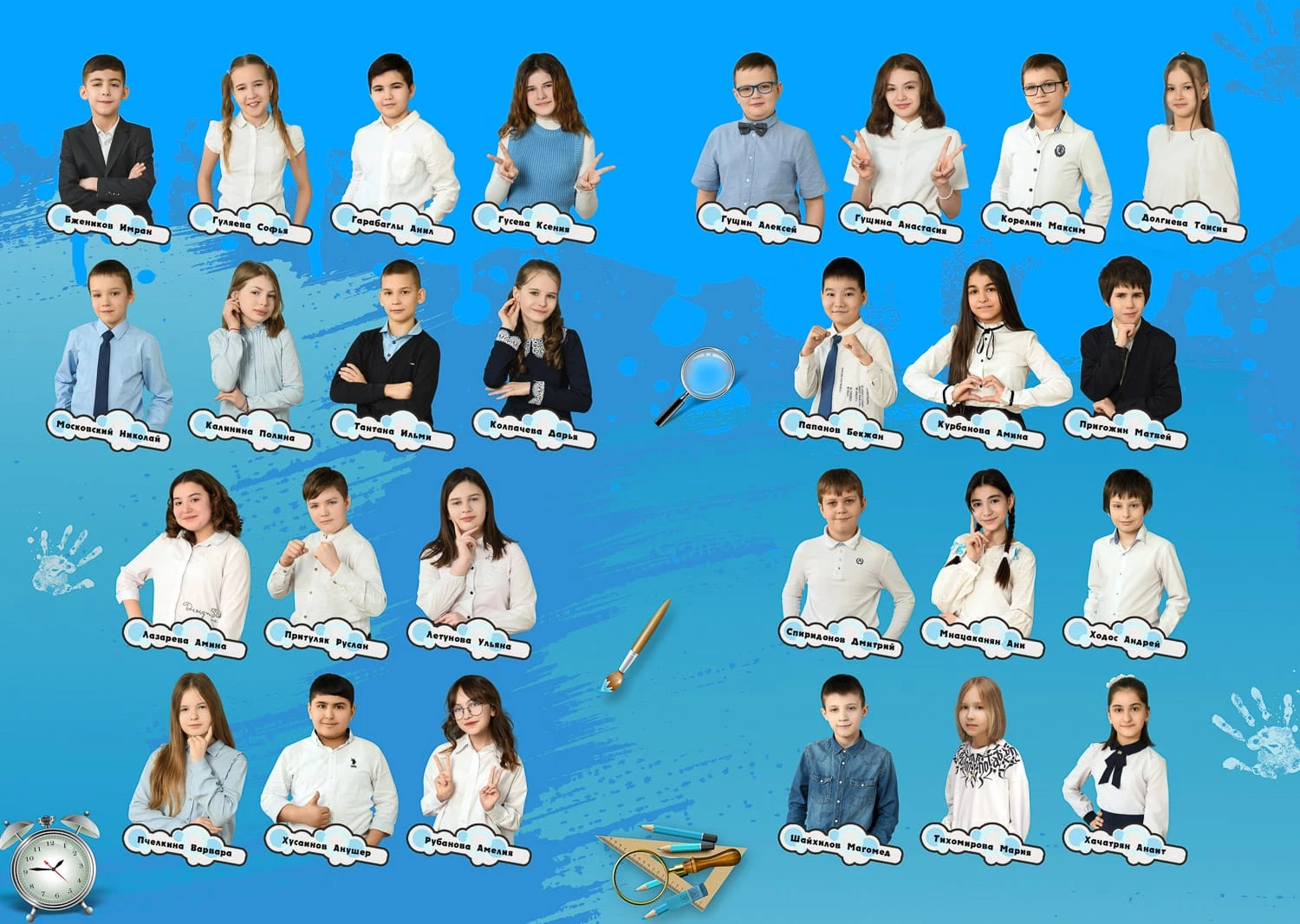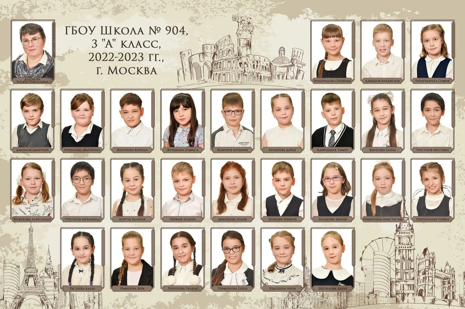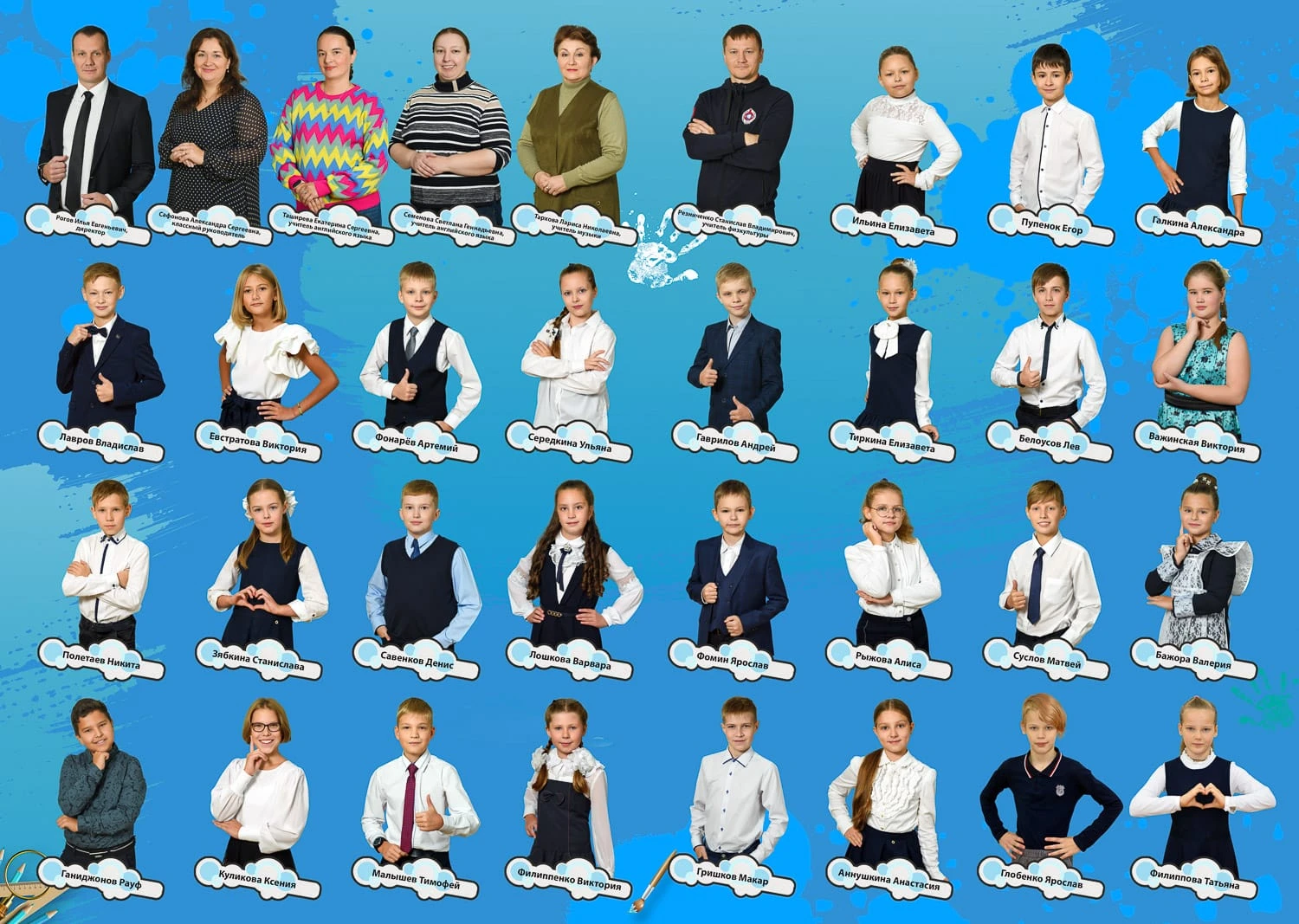Портрет ребенка слева, справа все дети и учителя.
