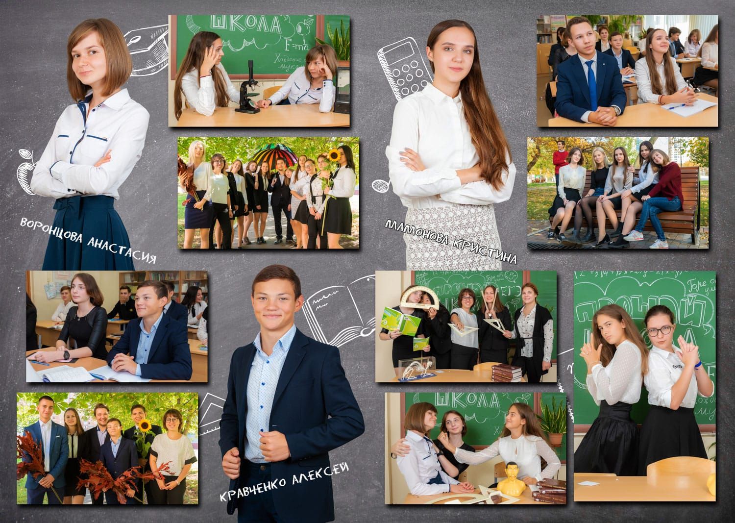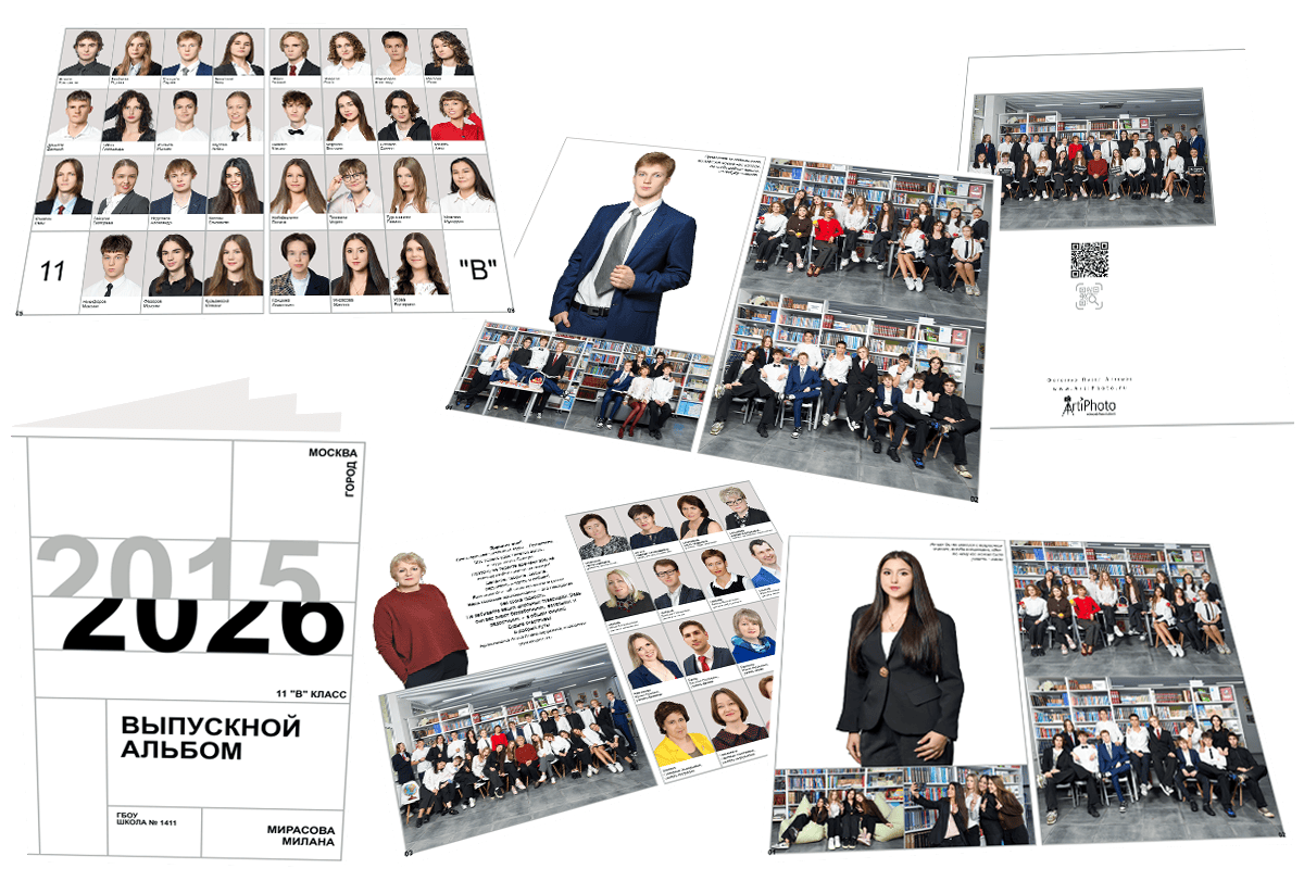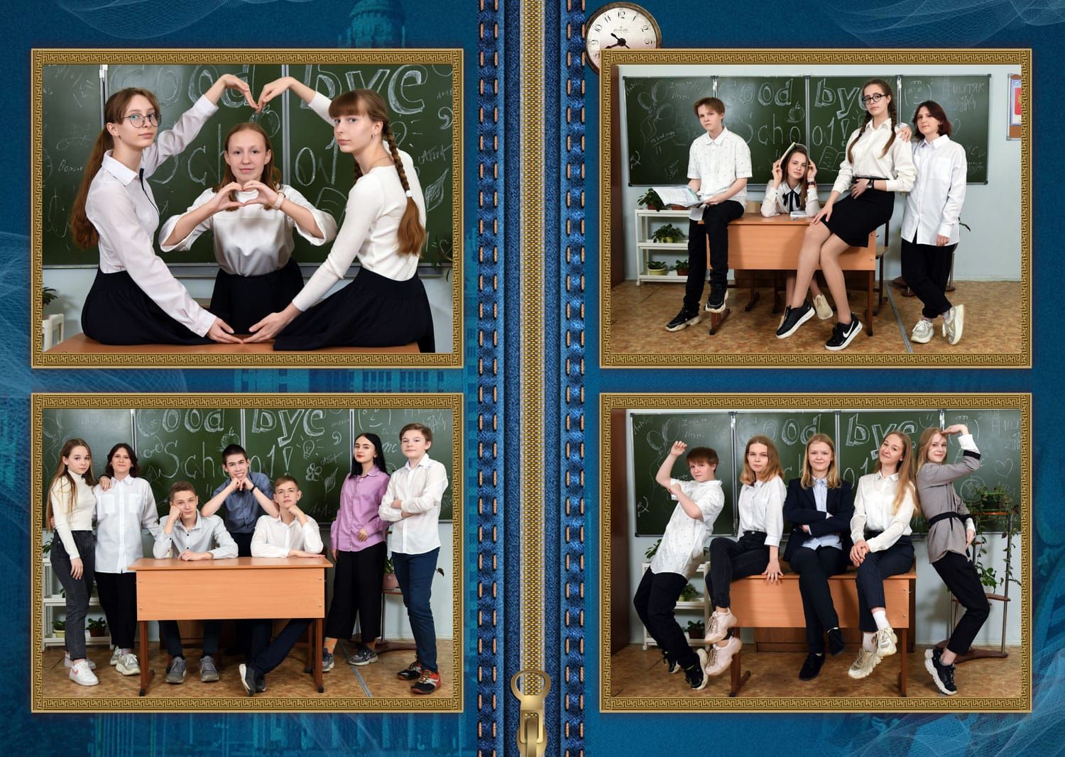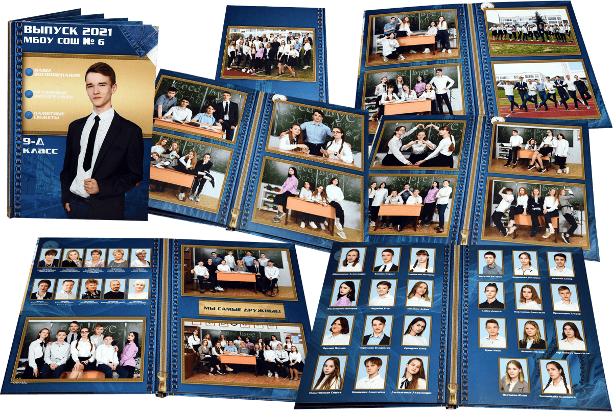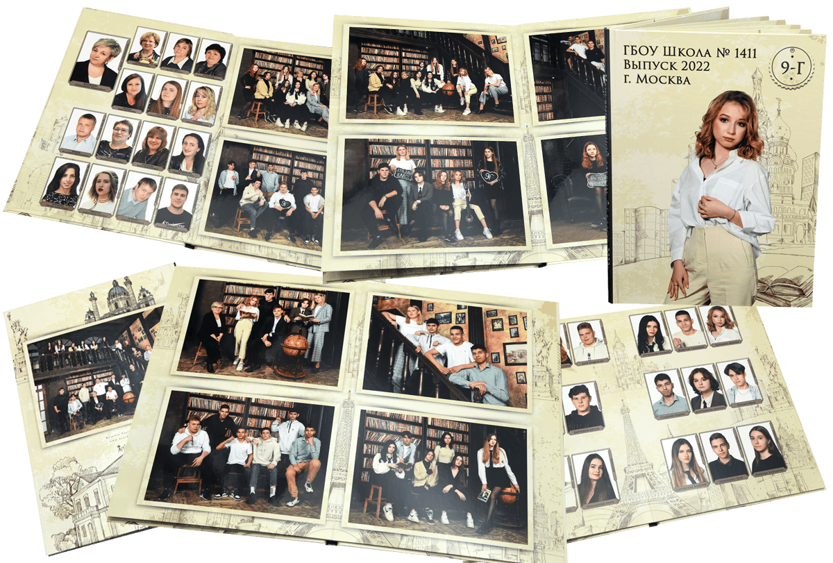 Альбом на 10 разворотов — самый полный и насыщенный формат для выпускного класса. Здесь достаточно места, чтобы собрать всё: портреты одноклассников и учителей, фотосъёмку в школе и на прогулке в парке, фотосессию в студии или городской библиотеке. Такой альбом становится настоящей историей класса!